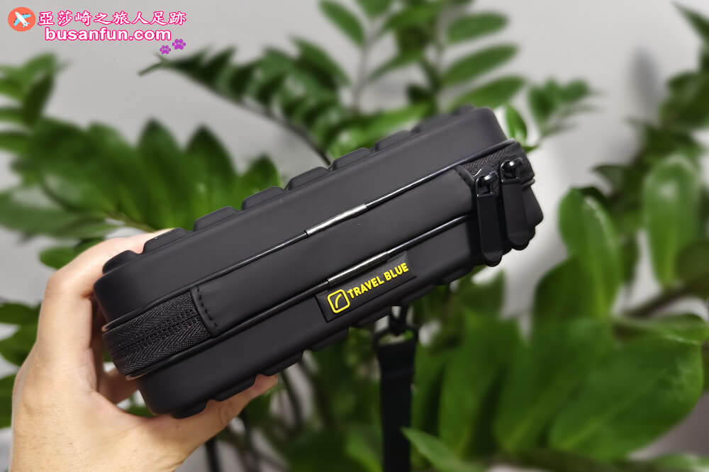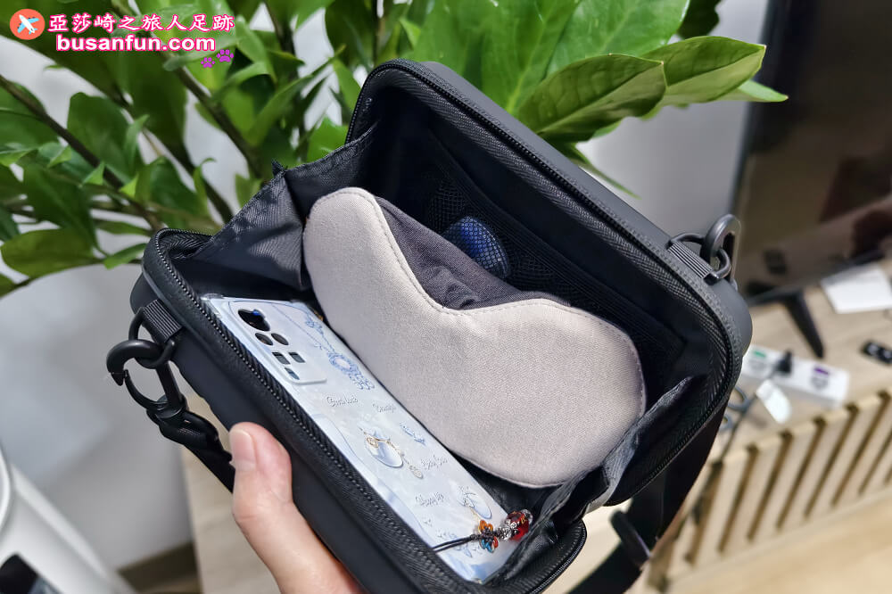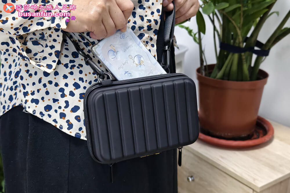 我覺得是因為硬殼的關係,能把搭乘交通工具需要用到的隨身物品輕鬆收納。比如說:手機、護照、耳塞、眼罩、信用卡、面紙、口紅等物品。